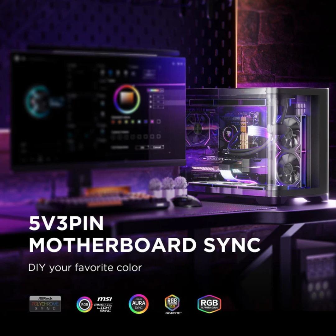 108 ARGB LEDs: Experience seamless lighting coordination with our ARGB technology, which allows individual control of each LED of 108. Compatible with major brands like ASUS, MSI, Gigabyte, and ASRock, it enables detailed software adjustments via a 5V 3-pin interface. This ensures your lighting effects are perfectly synchronized, creating a cohesive and dynamic visual experience in your gaming setup or home office.