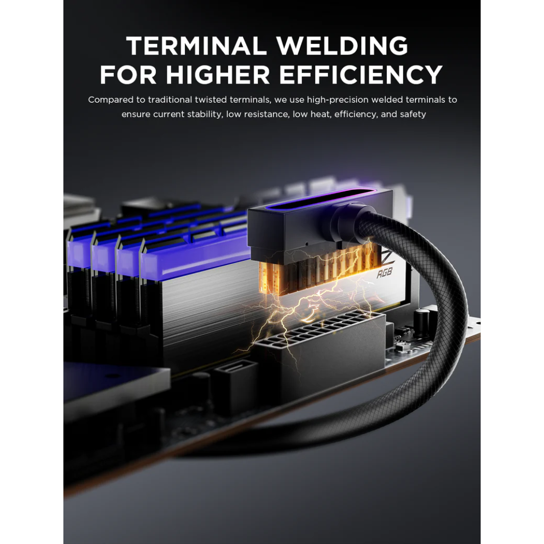 Integrated Minimalist Design: Designed with a seamless style and 90° right-angle connectors. No bending required—ensuring full terminal contact. Plug-and-play setup improves flexibility and keeps cable management clean, making it an ideal choice for PC DIY builds.