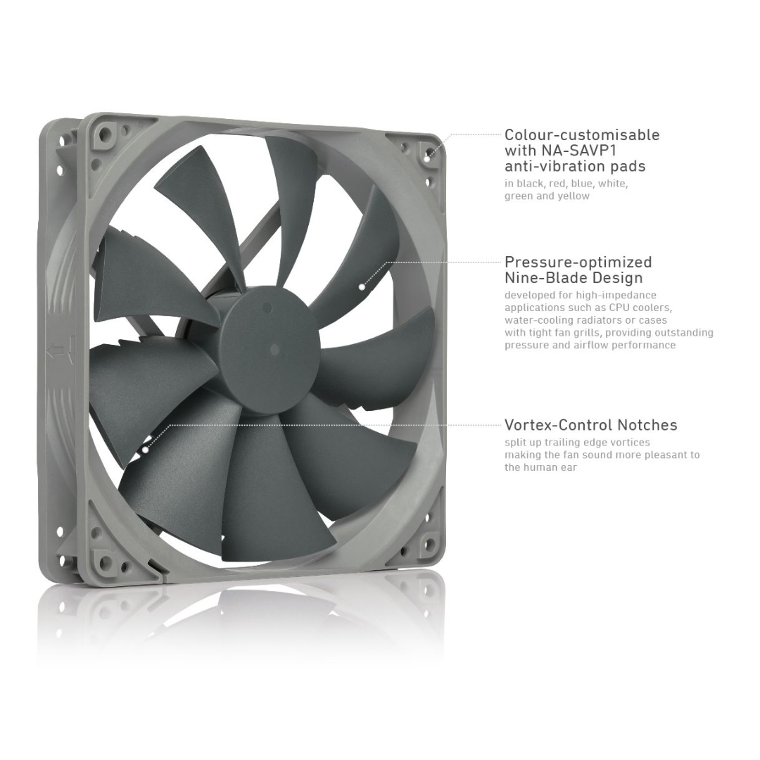 Specifically developed for high-impedance applications such as CPU coolers, water-cooling radiators or cases with tight fan grills, the NF-P14's nine-blade impeller provides outstanding pressure and airflow performance.