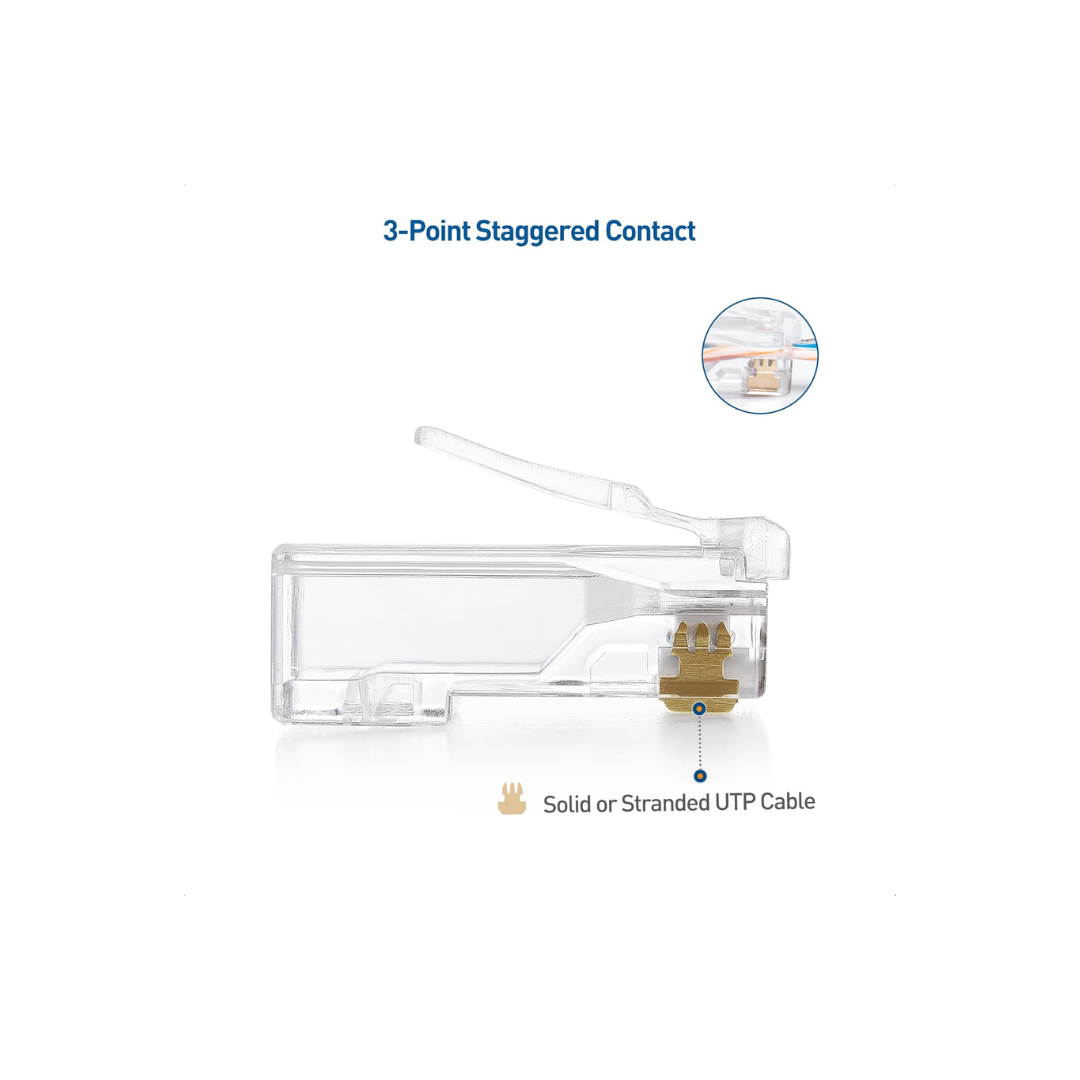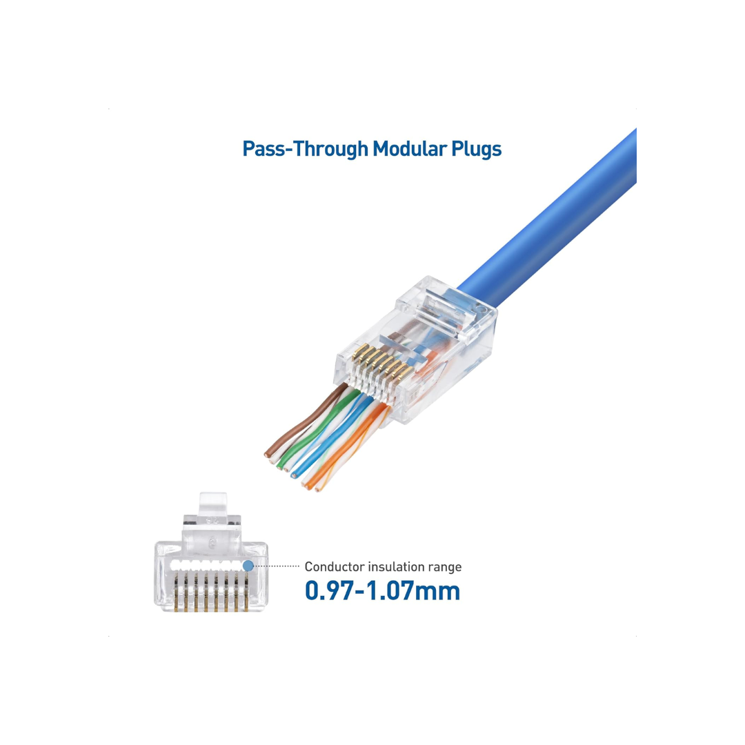 - Crimp style Cat6 pass through connectors terminate solid or stranded cable with a three point staggered contact to provide a secure connection; Simply feed the wires through the openings in the pass thru RJ45 connectors and crimp the connector for a faster termination with less effort