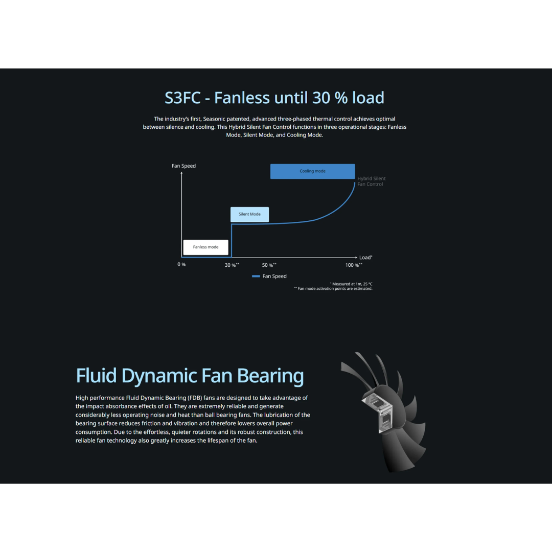 - Advanced Cooling & Silent Operation: 135mm Fluid Dynamic Bearing (FDB) fan with Seasonic Hybrid Silent Fan Control.