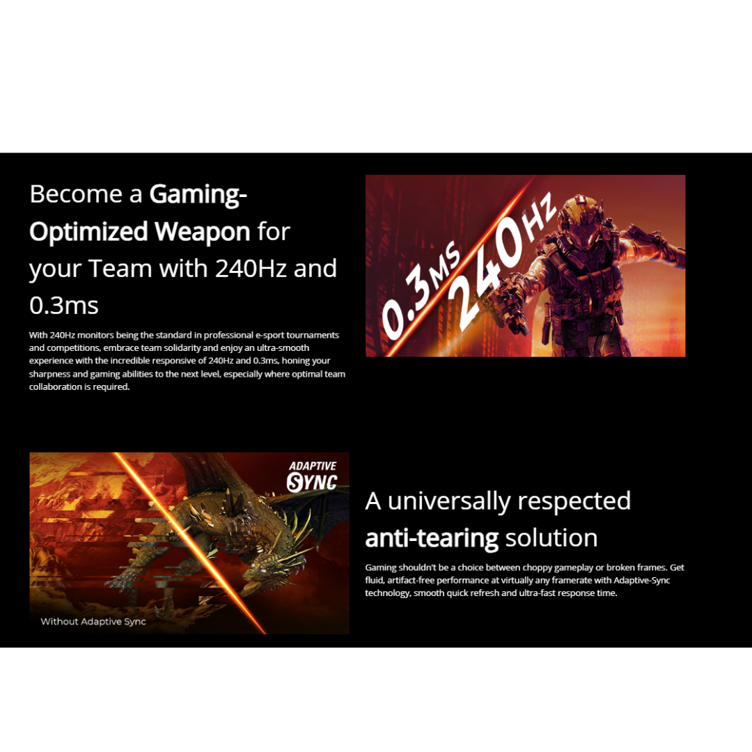 24G11ZE is a 23.8 inch gaming monitor, with Fast IPS, Adaptive Sync, 240Hz, 0.3ms, FHD @ 1920 x 1080 px, HDR10, 3-Sided Frameless, Low input lag, Flicker Free, Low Blue Mode. The e-sports professional standard for gamingWith a 240Hz refresh rate and 0.3ms response time, your display willbe equipped to perform at the pro gaming standard. Enjoy anultra-smooth experience with no visible screen blur to ensure you're always prepped to win.
