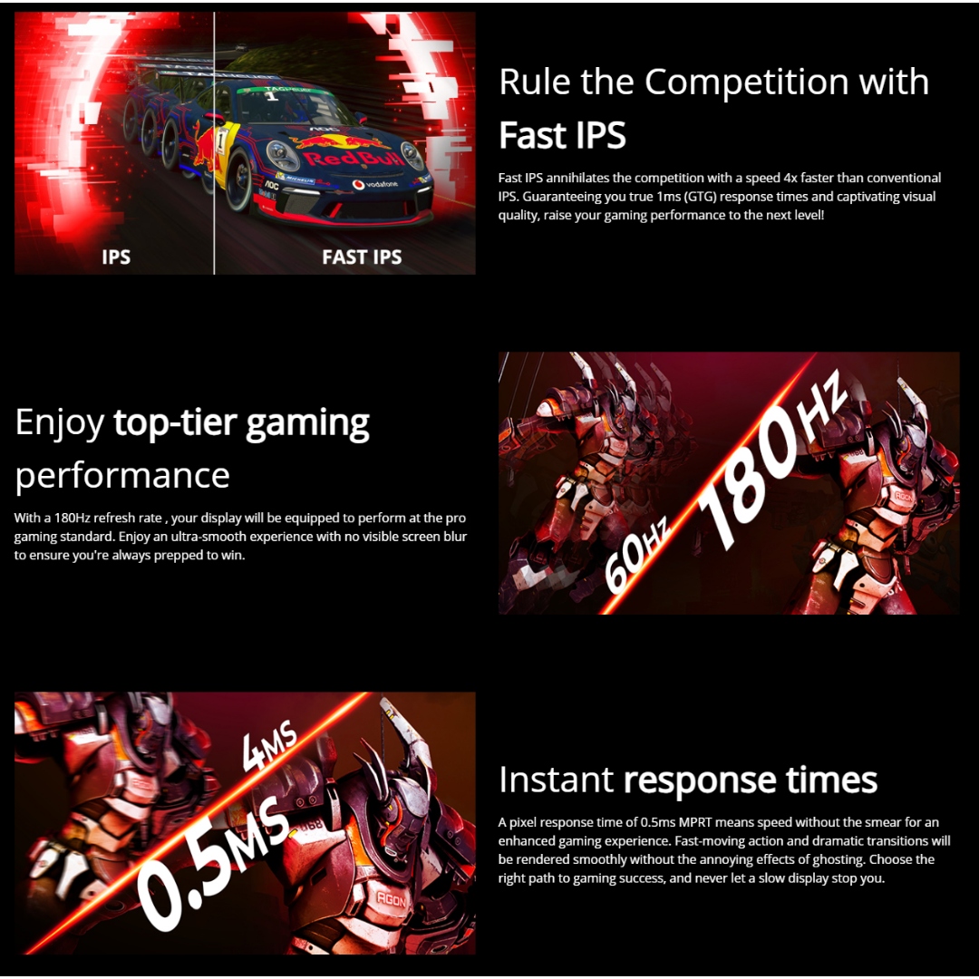 Only for the true valiant! This AOC 24G4E gaming monitor is made with a fast IPS panel, equipped with Adaptive-Sync technology, guaranteeing you unbeatable gaming experience with 0.5ms response time and 180 Hz refresh rate.