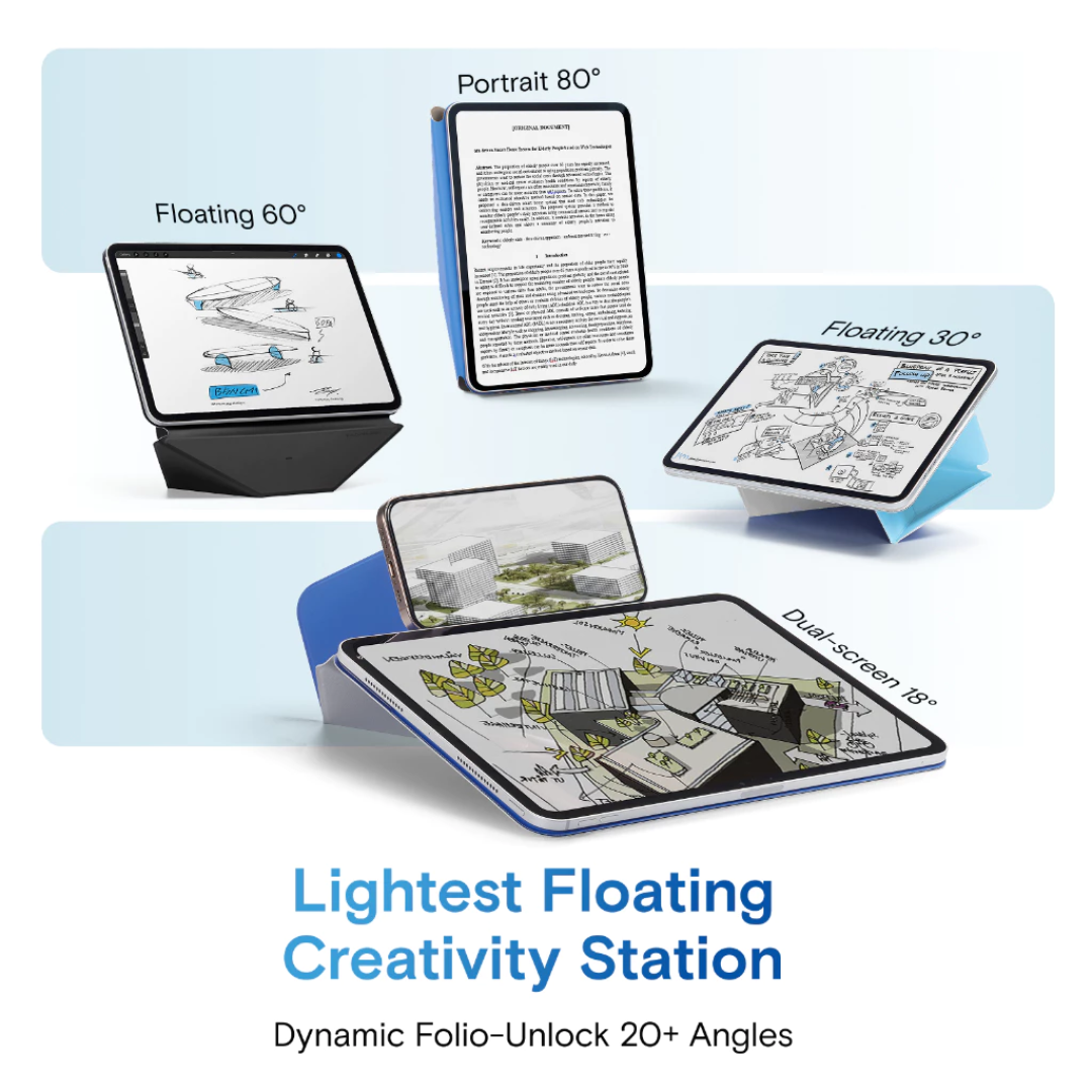 Uses origami-style folding to create a “floating” stand — gives more ergonomic viewing angles.