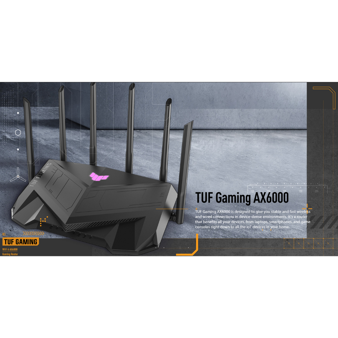 TUF Gaming AX6000 Dual Band WiFi 6 Gaming Router with dedicated Gaming Port, Dual 2.5G Port, 3steps port forwarding, AiMesh for mesh WiFi, AiProtection Pro network security and AURA RGB lighting