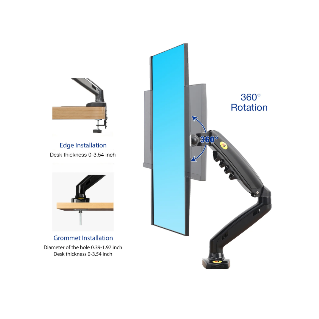 - FULLY ADJUSTABLE: The durable gas spring system ensure easy positioning of your monitor in any desirable position; Personalize your workstation any way you want; Support C-clamp or Grommet installation; comes with all needed hardware, Heavy duty construction and super quality materials keep your arm mount stable- This is the sturdiest desk mount on the market.