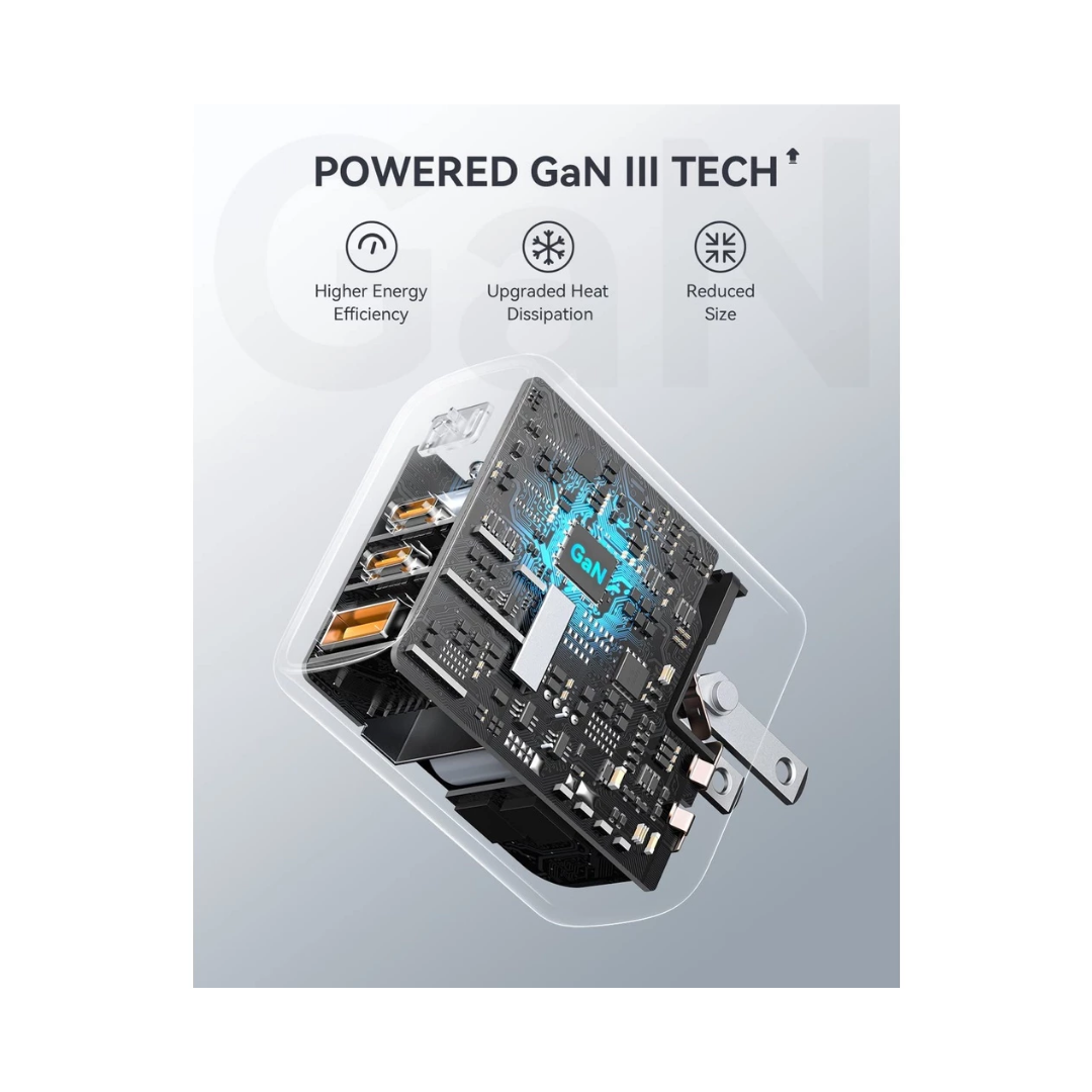 65W GaN Fast Charger – Ultra-compact triple-port adapter (Dual USB-C + USB-A) for powering phones, tablets, laptops & more.